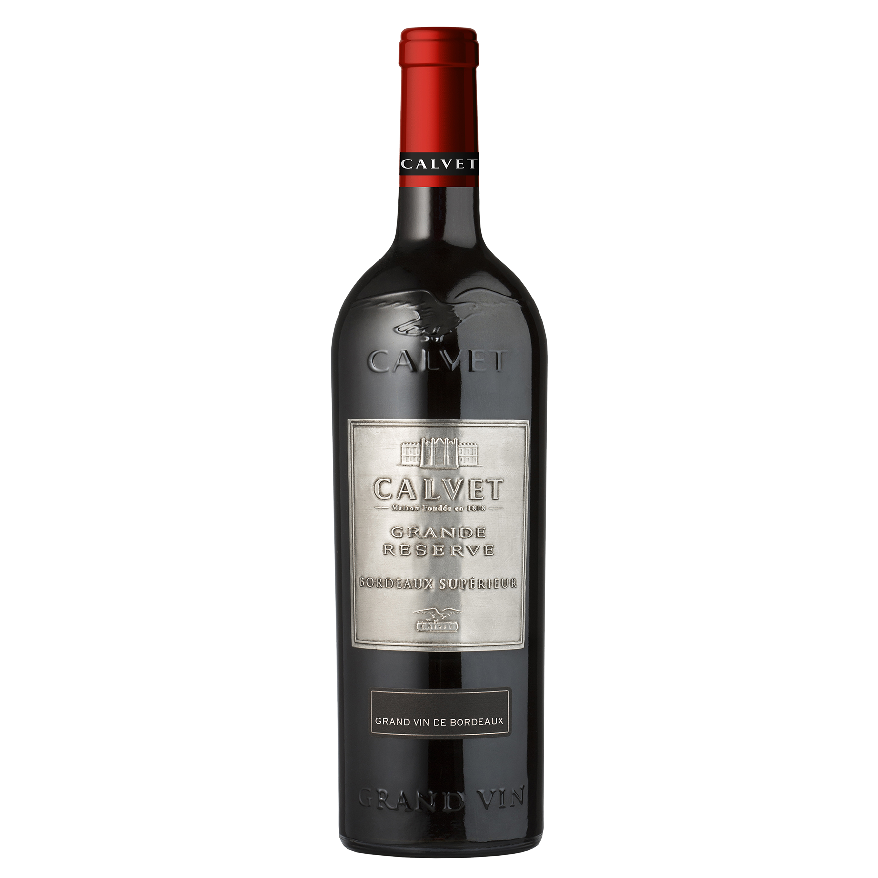 Calvet Grande Réserve Bordeaux Supérieur AOP is a refined French red wine, made from Merlot and Cabernet Sauvignon and aged in oak barrels. It offers a deep red hue with purple highlights, a powerful nose of red fruits and spices, and a structured palate with cherry, vanilla and a lingering finish.
